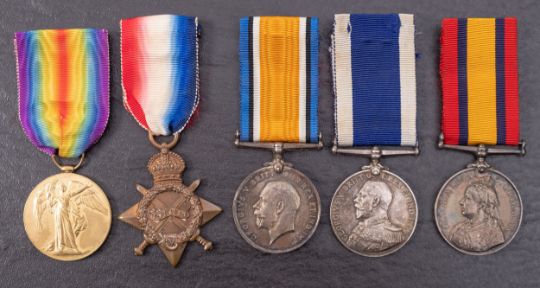 A South Africa and WWI group of five, '341524 H.D.Johns SHPT.1.RN', Queens South Africa Medal, 1914-15 Star, war medal, Victory Medal, and GRV Royal naval LSGC (HMS Orian)