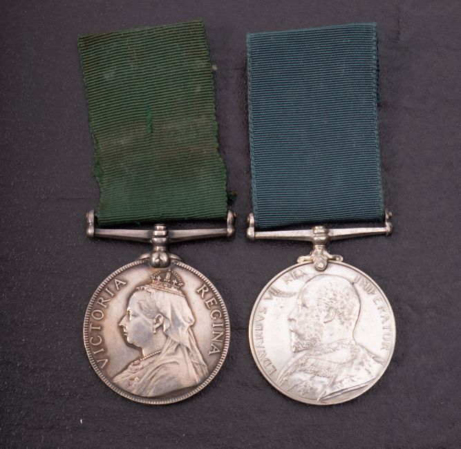 An Edward VII Volunteer Long Service Medal, '7342 L.Sjt S.W.Pringle, The Queens R.V.B.Rl.Scots', together with a Victorian Long Service Medal (unnamed)