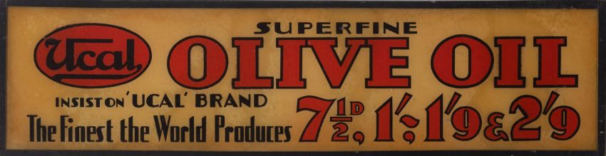 A group of seven various Ucal ' glass advertising signs, including 'Surgical Dressings' and others (7) 14 x 54cm