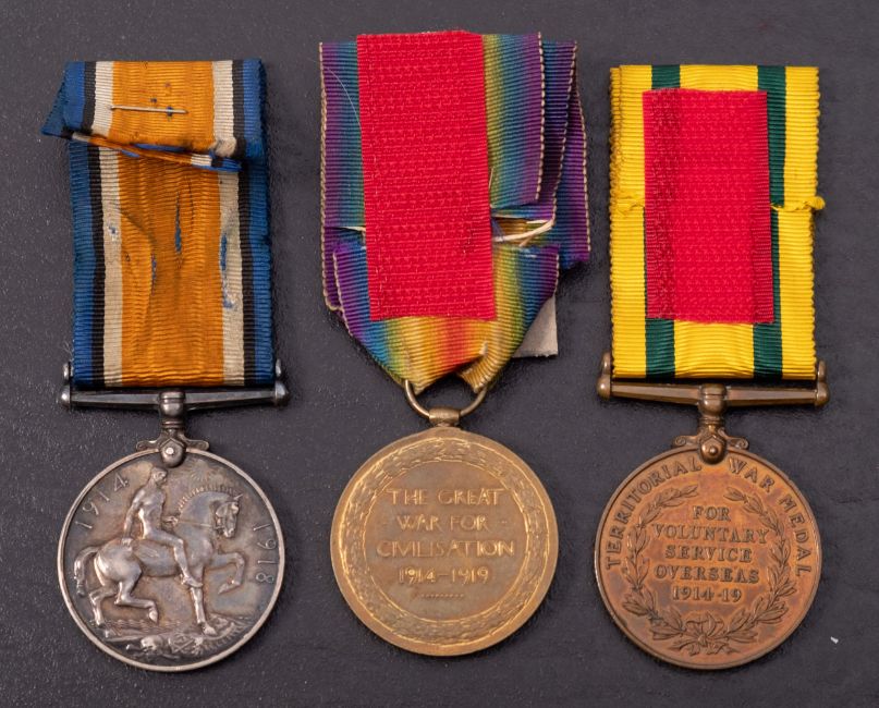 A WWI trio consisting of War medal, Victory Medal, and Territorial Force Medal '1455 Pte W.Howe Som.Li'