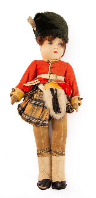 Lenci, Chad Valley or similar. An early 20th century linen head Highland Guardsman doll, brown hair over a linen head inset blue glass eyes and painted face, jointed linen body dressed in regimental uniform with bearskin hat, white felt and black leather boots, 46cm tall without bearskin.