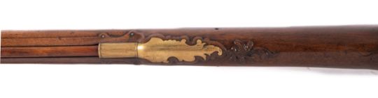 An Austrian percussion cap rifle, the 27 inch octagonal rifled barrel with fore and rear sights, with additional target sight to tang, plain sidelock action with foliate chased hammer, brass shaped trigger guard and fittings on a walnut stock, 103cm long