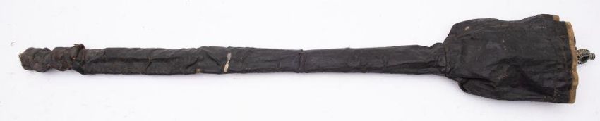 A Victorian court sword, retailed by Hebbert & Co, London, the straight double edge blade with acid etched decoration, crown and 'VR' cipher , above a gilt brass hilt with double scroll quillons and beaded shell, single bar guard and square section, brass grip decorated en suite, together with a gilt brass mounted black leather scabbard and black suede lined travel cover, blade length 81cm, (scabbard in two sections).