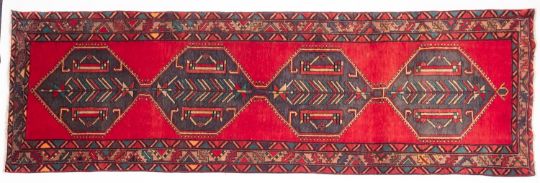 A Heriz runner, the red field with a row of four sea green hexagonal medallions, enclosed by a main pistachio serrated diagonal striped border, 325cm x 108cm.