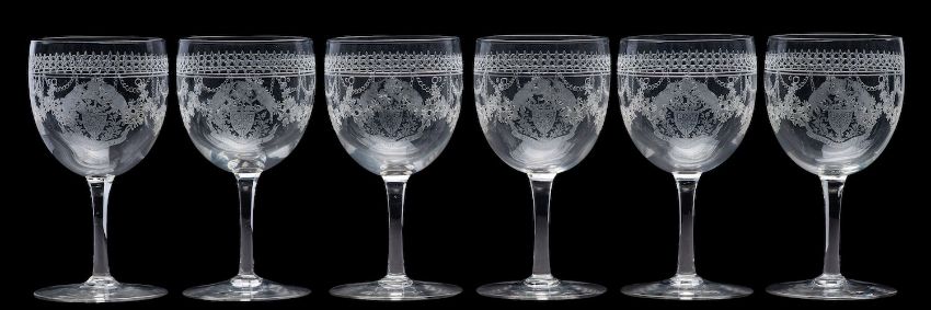 Of India Interest. A set of six late Victorian/ Edwardian sherry glasses each etched with garlands and an elaborate coat of arms inscribed 'Dinapur Raj', 11cm.Note: The Dinapur Rajbari is a palace in Bangladesh which was originally built in the 14th century. Over the years it was destroyed and rebuilt but after the partition of India and Pakistan was abandoned and stands in ruins as an ancient monument.