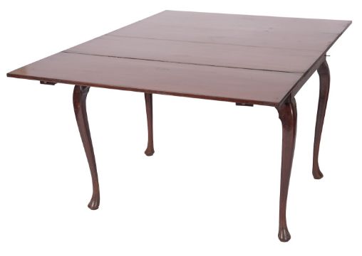 A late George II or early George III mahogany extending supper table, circa 1760, the rectangular top with twin hinged leaves opening to two lopers at each long side; on cabriole legs to pad feet; 73cm high, 143cm long, 104cm wide
