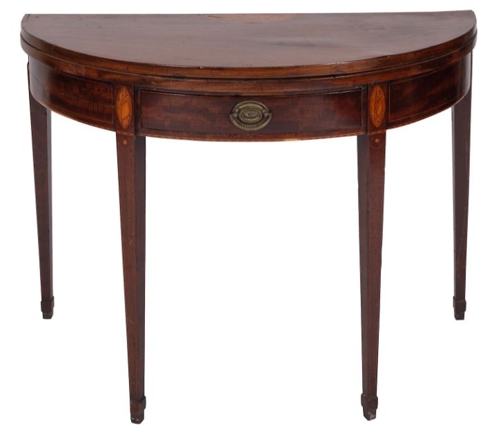 A George III mahogany demi-lune tea table, circa 1800; the hinged top with marquetry conch shell motif; the drawer with brass swing handle, the straight legs tapering down from further marquetry conch motifs to gaitered feet; 75cm high, 102cm wide, 46cm deep, closed