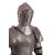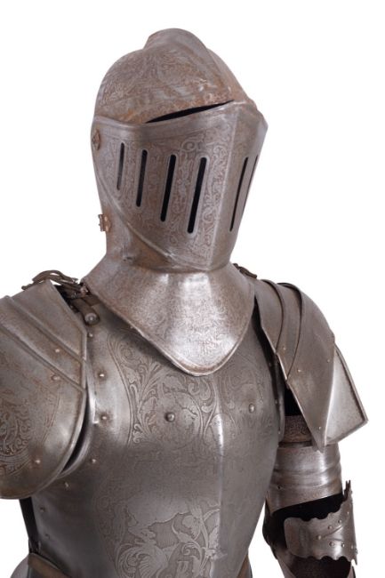 A near pair of metal suits of armour in Italian 16th century style, late 19th /early 20th century; with etched arabesque and foliate decoration throughout; each with closed helmet and hinged visor, breast and back plate with gorget, the arms with vambraces, pauldrons and gauntlets, knee length assets above cuisse, poleyn, greave and sabaton leg armour; mounted on a wood base; 184cm high overall, 69cm wide, 46cm deep
