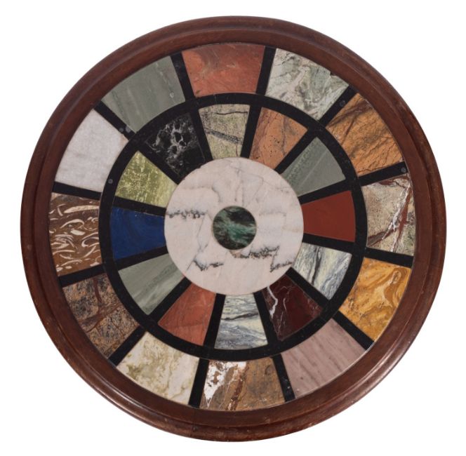 A sample marble and mahogany circular occasional table, third quarter 19th century; the top with radiating segments of lapis lazuli, marmo rosso antico and marmo Siena amongst others, within a moulded edge; on three columnar supports to a circular boss, on three downscrolled legs; 67cm high, the top 39cm diameter