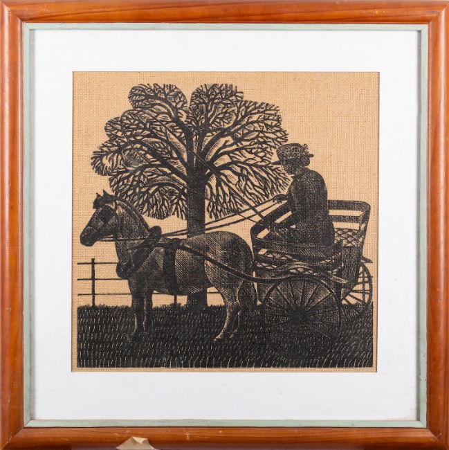 Eric Ravillious (British, 1903-1942)Lady in a horse cartWoodcut on hessian30.5 x 31cm