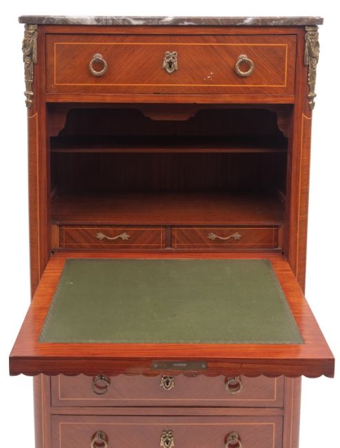 A mahogany, gilt metal and marble mounted secrétaire à abattant in Louis XVI style, 20th century; the striated dark brown, grey and white top above a drawer and a lobed fall front, opening to a fitted interior; above four further drawers, all with twin metal ring handles; on toupie feet; 145cm high, 70cm high, 38cm wide.