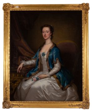 Continental School, 18th CenturyPortrait of a lady, seated, wearing a white silk dress and blue coatOil on canvas125.5 x 100cm