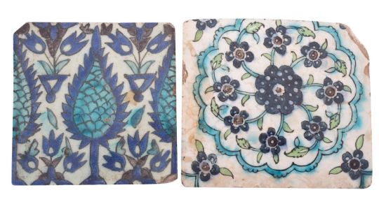 Two Isnik pottery tiles, Damascus 17th century the first decorated in cobalt blue and turquoise with stylised cypress trees and vases of tulips, 22cm [some damage and losses]; the second with a foliate shaped panel of a central flower head with radiating stems, 23 x 26cm [some damage and losses] 2.