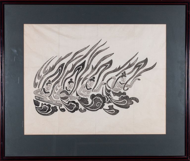 A pair of Balinese woodblocks, depicting musicians playing stringed instruments, 50 x 66cm, together with a similar 44 x 39cm, framed and mounted.