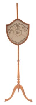 A satin birchwood firescreen, 19th Century; the crest-shaped panel with embroidered and sequined silkwork with a central medallion depicting a lady, on turned baluster support terminating in three lined splayed legs; 60cm high overall