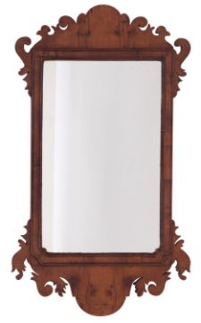 A yew wood framed wall mirror in George I style, late 19th /early 20th century; with fret cut scrollworked cresting, corners and apron; 63cm high, 37cm wide