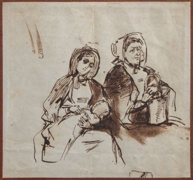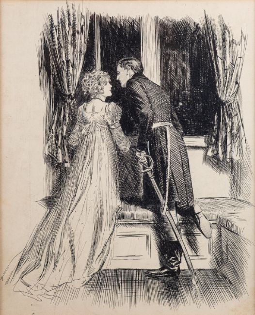 Henry Matthew Brock (British, 1875-1960) An entrance scene Pen and ink drawing 18 x 14cm Signed lower left Together with Fred Pegram (British, 1870-1937), a group scene, an ink drawing, signed and dated 98; and two other unsigned Victorian ink drawings with genre scenes (4)