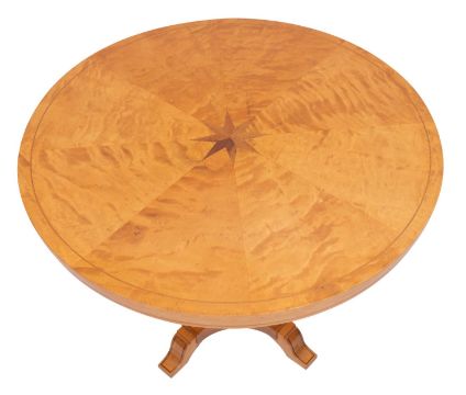 A maple and parquetry centre table in Biedermaier taste, modern; the circular top with central stellar motif and radiating veneers; the lobed urn stem with Greek Key stringing, on a quatreform base with splayed feet; 71cm high, 96cm diameter