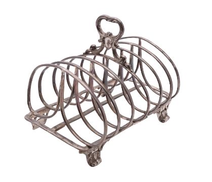 A Victorian silver seven bar toast rack, markers mark M.R also stamped Makepeace London, London 1840?, marks poorly struck, of rounded rectangular form, scroll wire bars, central carrying handle, on four bracket feet, 15x11cm (6x4 1/4in), 333g (10.7oz)
