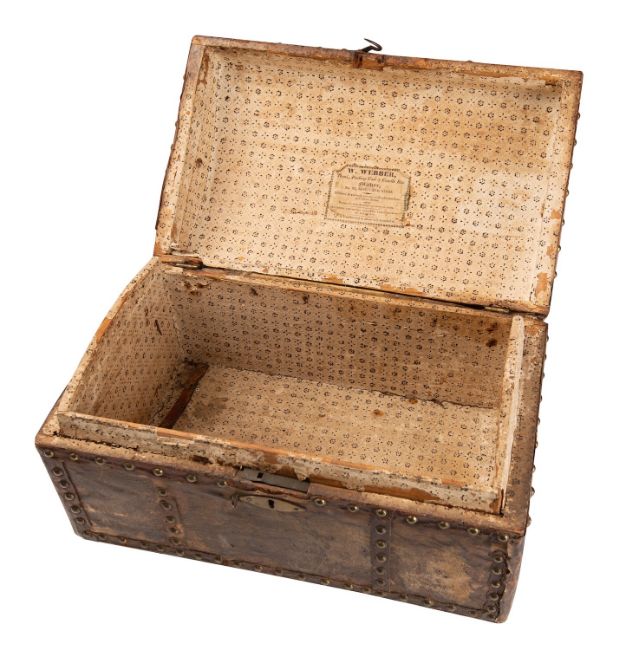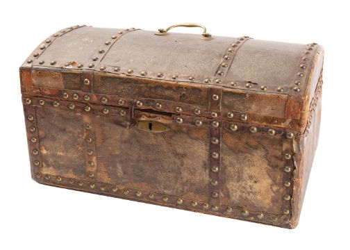 A George III pony hide and studded leather travelling trunk, late 18th century; the domed and hinged cover with brass swing handle; the interior with original paper lining and maker's label for W.WEBBER Trunk, Packing Case and Candle Box Maker, 52 Kingsland Road; 24cm high, 45cm wide, 28cm deep