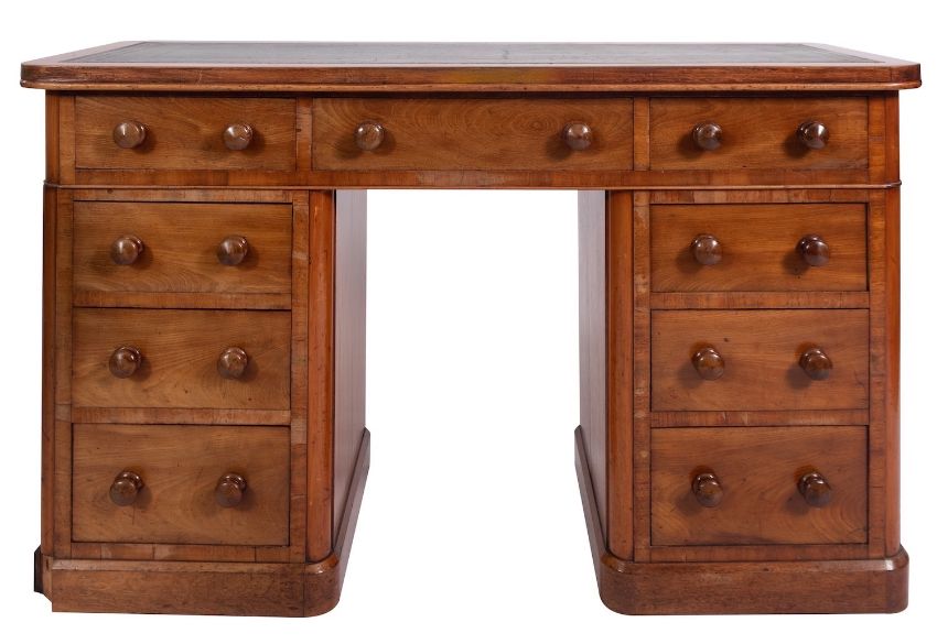 A mahogany pedestal desk in Regency style, second half 19th century; the cleated rectangular top with rounded corners and inset gilt tooled leather skiver; above an arrangement of nine drawers around the kneehole, all with turned knob handles; on plinth bases; 76cm high, 125cm wide, 50cm deep