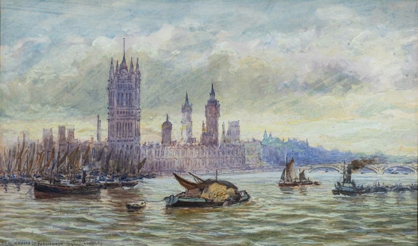 John Chambers (British, 1852-1928) London, Houses of Parliament Watercolour 28 x 48cm Inscribed and signed lower left