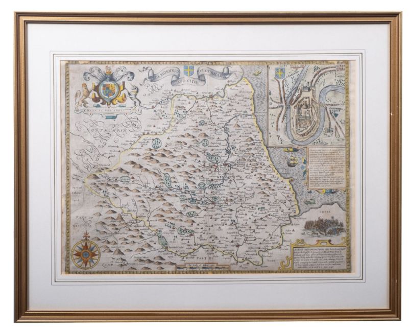 DURHAM, The Bishoprieke and Citie of Durham. Hand coloured map, by John Speed, attractively f&g, circa 1610, with English text in the verso, 37.5cm x 49.5cm
