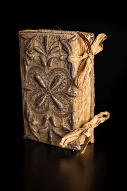 EMBROIDERED BINDING. Bible, English, London: Bonham Norton and John Bill 1628, woodcut title, with Apocrypha; WITH The New Testament of our Lord and Saviour Jesus Christ. London: Bonham Norton and John Bill 1628, woodcut title; WITH The Whole Booke of Psalmes: Collected into English Meeter, by Thomas Sternhold, John Hopkins, and others, London: Imprinted for the Company of Stationers, 1628, woodcut title, in an embroidered binding with silver thread, raised stumpwork, the upper and lower covers with four petal flowerhead flanked by formal scroll above and below, the spine in four compartments with worked stars on a cream ground, all edges gilt with gauffered scroll foliage, 155mm x 97mm, 8vo