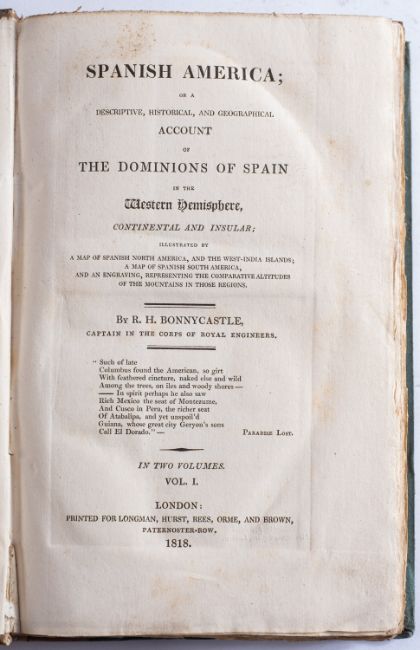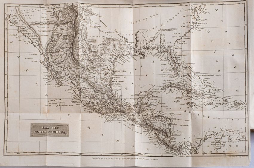 BONNYCASTLE, R. H. Spanish America: or a descriptive, historical, and geographical account of the dominions of Spain in the Western Hemisphere, London: Longman, Hurst, et al 1818., 2 vols, two folding maps, original paper covered boards with printed paper label on the spine, which is starting to deteriorate, contents clean and fresh; 8vo; GRATTAN, Thomas Colley. Civilized America, London 1859, 2 vols. in 1, 2 maps (1 folding), full calf gilt, thick 8vo (3)