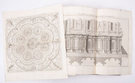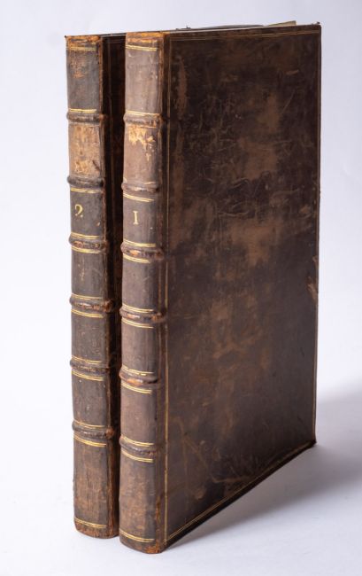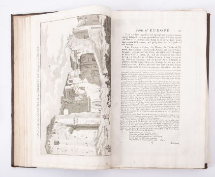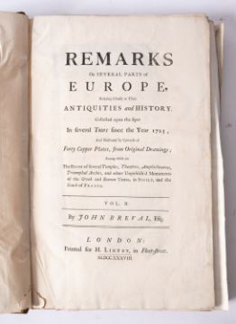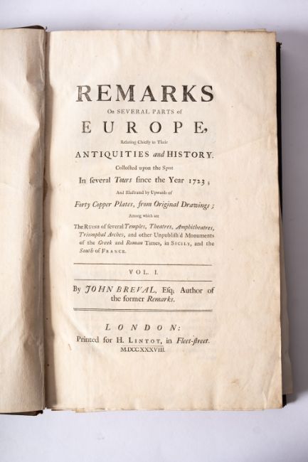 BREVAL, John. Remarks on Several Parts of Europe, relating chiefly to their Antiquities and History, collected upon the spot and several tours since the year 1723; and illustrated by upwards of 40 copper plates, from original drawings... etc, printed for H. Lintot 1738, 2 vols, 42 engraved plates, full calf rubbed, folio (2)