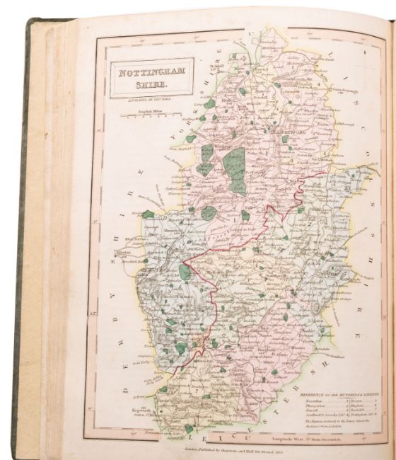 [ATLAS] HALL, Sidney. A New British Atlas, London: Chapman & Hall 1834, 46 hand coloured maps, mainly in good order, recent quarter morocco, orig. green cloth boards with title in gilt to upper cover, 4toThe Inland Navigation plates missing at the rear of the book