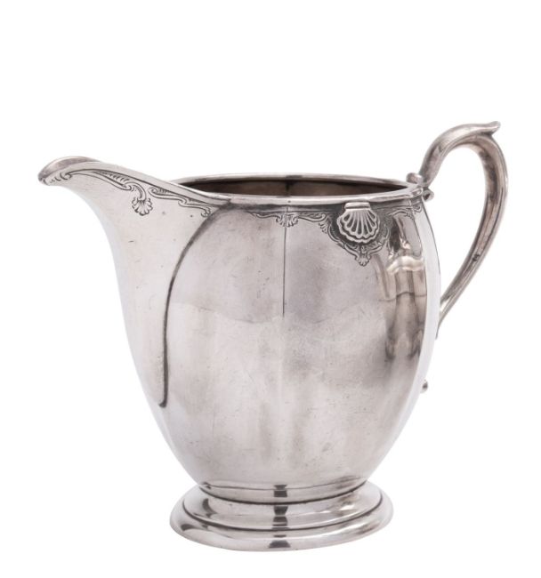 A George V silver milk jug by Edward Barnard & Sons Ltd, London 1933, of canted baluster form with applied shell rim and engraved decoration, 9.5cm (3 3/4in), 262g (9.25oz)