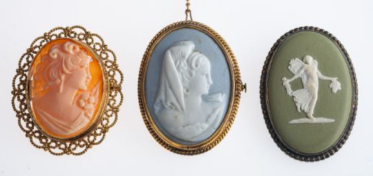 A shell cameo brooch in filigree gold mount, 9ct, a Limoges porcelain brooch and a Wedgwood Jasper ware brooch, largest 4cm