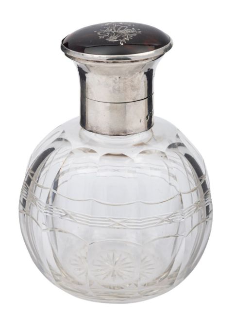 A silver, tortoiseshell piqué and facetted glass cologne bottle, maker's mark illegible, London 1915, the cover with a tied ribbon suspending a basket of flowers, 12cm (4 3/4in) high
