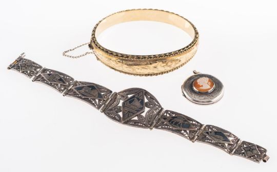 A Silver shell cameo locket pendant, 2.5cm diameter; a niello bracelet; and a rolled gold bracelet
