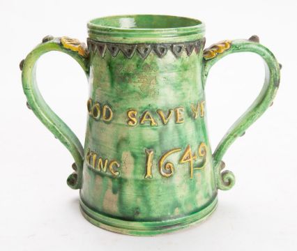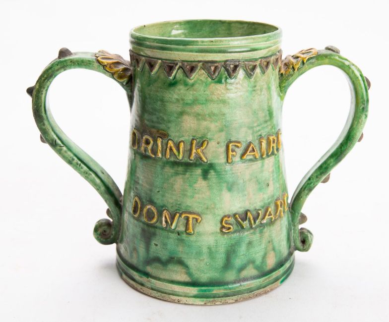 A Castle Hedingham pottery loving cup, of tapering cylindrical form embossed 'Drink faire don't sware' and verso 'God save ye King 1648', under pale green wash, embossed and incised marks, late 19th century, 14 cm high.