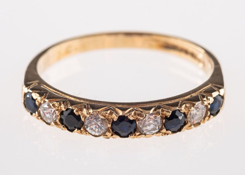 A 9ct gold and nine stone eternity ring, sapphires and diamonds.