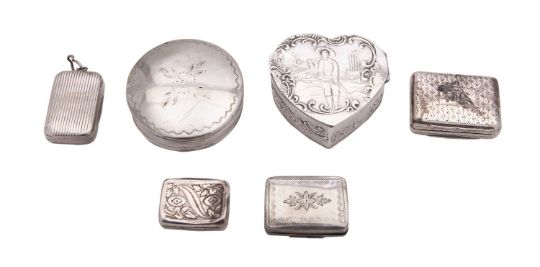 A group of six silver small boxes, comprising: a George IV rectangular vinaigrette by Thomas Shaw, Birmingham 1824, pricked with bands, engraved with a monogram, the gilt interior with a flower and scroll foliate grille, 3.2cm (11/4in) long; another smaller by William Pugh, Birmingham 1811; two others lacking their grilles; a heart shaped box, pseudo marks probably Hanau, import marked for London 1895, sponsor's mark of Samuel Boyce Landeck; and a Dutch circular box by Cornelis Snel, Schoonhoven, 1814-1953 second standard (.833), early 19th century (6)