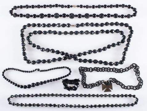 A Whitby jet necklace, an interesting jet imitation necklace, possibly, horn, a Vulcanite cross and chain, a jet brooch, and others, all 19th Century