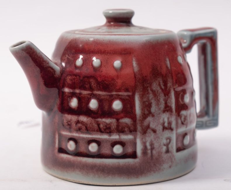 A Chinese copper red glazed teapot and cover, of circular squat form, the sides moulded in relief with four panels each containing three rows of studs, 11.5cm.