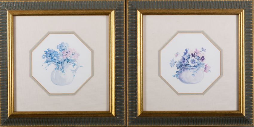 Two coloured prints of flowers in vases, framed, each 14 x 14cm
