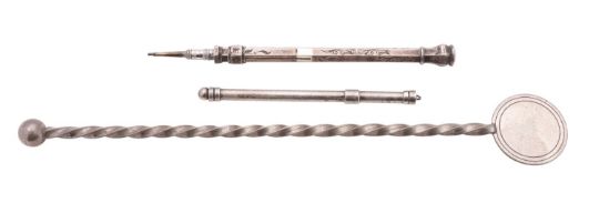 A late Victorian silver retractable pencil by Sampson Mordan & Co., unhallmarked, stamped S. MORDAN & Co MAKERS, scroll and foliate engraved, 11.5cm (4 1/2in) extended, a twist stem swizzle stick by Garrard & Co. Ltd, London 1997, stamped for Garrard as retailers, 20cm (8in) long; and a telescopic swizzle stick, maker's mark indistinct (probably Garrard & Co.), Birmingham 1998 (3)