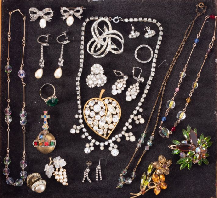 A group of costume jewellery including paste and glass set brooches, necklaces and earrings