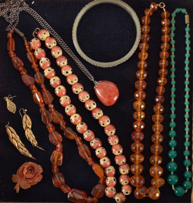 A 1950's Venetian glass necklace with aventurine decoration two amber bead necklaces and other items