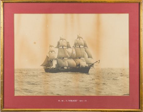 A black and white photograph of the Royal Navy Corvette HMS Volage: inscribed to mount 'HMS Volage 1875-79' framed and glazed, 40 x 56cm. *Notes- HMS Volage was a Volage-class corvette that served much of her time as part of the Flying Squadron circumnavigating the world. This is an example of one of the earliest ship portrait photographs.