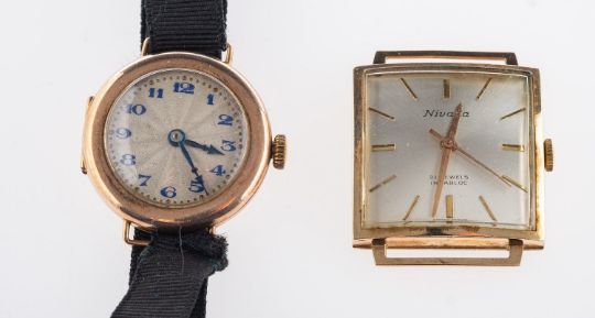 Two 9ct gold watches, including a vintage square shaped 9ct yellow gold Nivada watch face (no bracelet/strap), silvered dial with gold batons and arrowed hands, manual wind movement, marked 21 Jewels, 2390, marked inside of backplate with UK hallmark, B.W.C, London Made, 68659, weight of case (without movement but inc. glass), 8.3grams, case diameter approx. 27mm; and an antique 9ct yellow gold circular faced wristwatch on black ribbon strap with rolled gold clasp, dial with blue steeled numerals & arrowed hands, manual wind, marked inside backplate with UK import mark, DBs, 102540, movement Swiss made, marked Texina, total gross weight 14.2grams, (2).