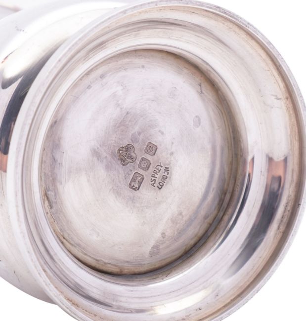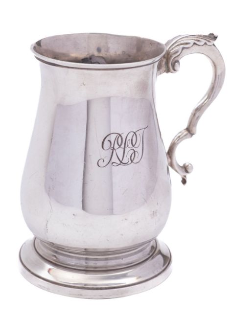 An Elizabeth II silver christening mug by Asprey & Co Ltd, London 1960, of baluster form, engraved RLT, with S scrolled acanthus leaf capped handle 10.5cm (4.1in) high, 228g (8oz)