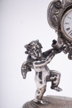 An Italian silver figural watch stand, apparently no maker's mark, bears Rome 1815-70 2nd standard mark, probably third quarter 20th century, the scrolled paper cartouche supporting the watch, held aloft between two cherubs, each standing on one leg, on a scroll engraved shaped rectangular plinth, on a marble base, 23cm (9in) high, loaded; and Anon., a silver open face keyless wind pocket watch, Birmingham 1902, 48mm diameter