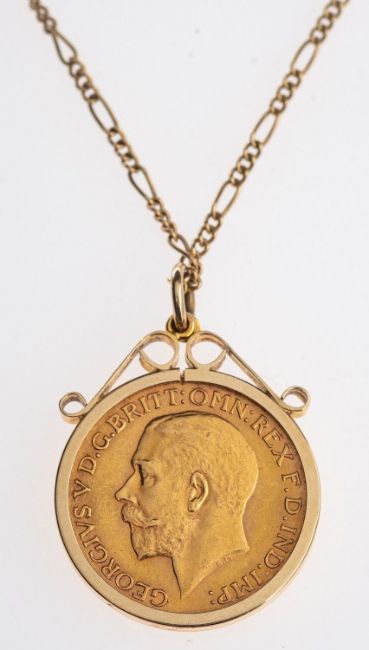 A full sovereign in pendant mount and chain, a George V 1926 full sovereign in a 9ct yellow gold pendant mount, UK hallmark, on a fancy figaro link chain, faintly marked 9ct on bolt ring, length approx. 55cm, total gross weight 13.2grams.