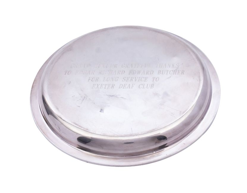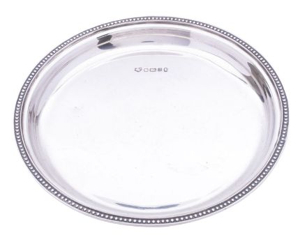 An Elizabeth II silver waiter by J. N. Lowe (Sheffield) Ltd, Sheffield 2004, of circular form with beaded rim, presentation inscription, 17.7cm (6.7in), 244g (7.8oz)